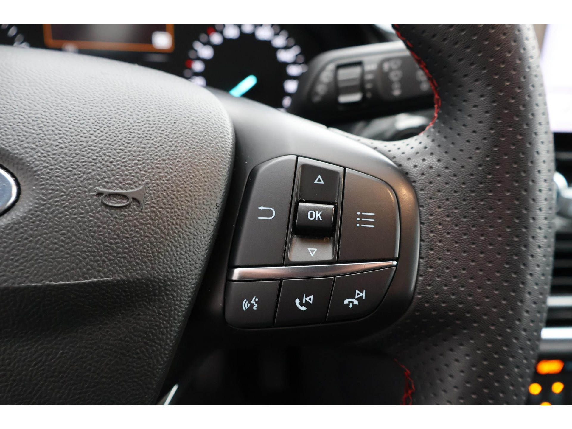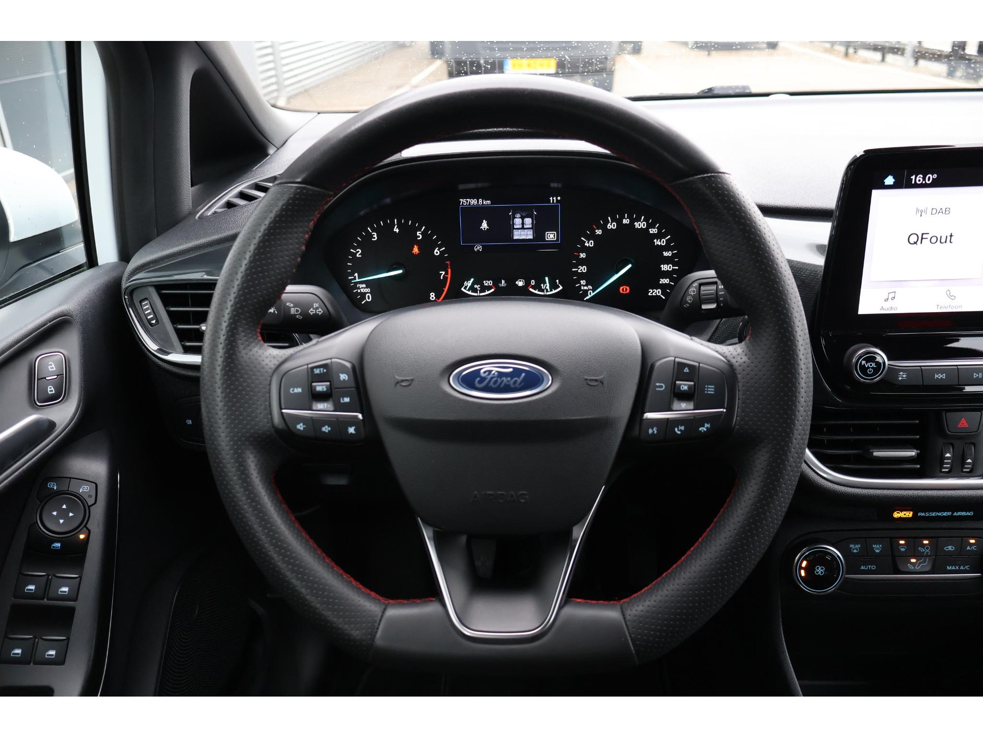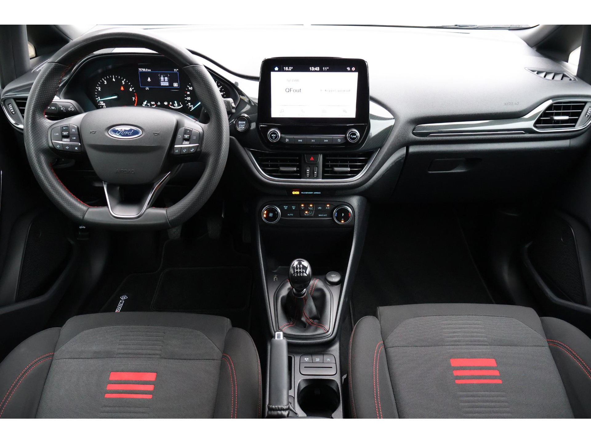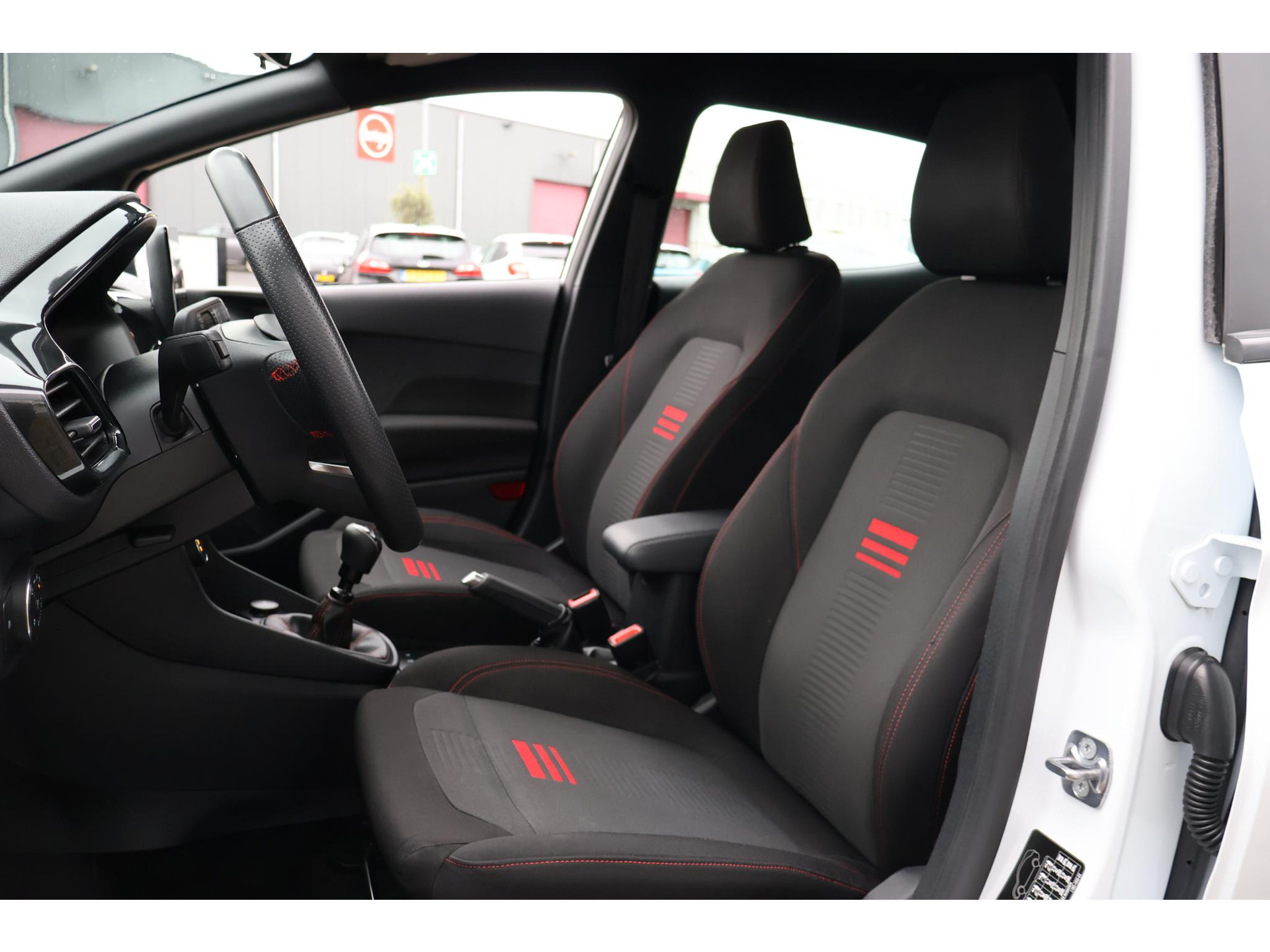 Interieur: zwart/rode stiksels, Stof